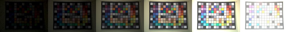 I converted them once with Adobe Camera RAW, and once again with the procedure listed above. Using a Photoshop action to do a perspective crop, median filter, and nearest-neighbor resize, I created a series of 14 by 10 images; one pixel per patch on the chart.
