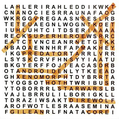 $ python solve.py -w depth0.txt puzzle.txt Puzzle is 19 by 19 Loading depth0.txt 5335 words <manually snipped to remove lots of garbage results> * 2,11 E: ANDROID * 3, 8 E: PREDATOR * 4,11 E: DROID * 5,14 W: ROBOT * 6,16 W: WIZARD * 7, 2 SE: ENTERPRISE * 9, 5 E: HERO * 9,14 E: STARWARS * 10, 2 SW: ALIEN * 11,15 N: BATTLES * 12,12 SE: DRAGON * 13, 7 SW: MASTER * 15,16 E: WOLF * 17,13 N: STARTREK * 18, 2 SW: BEAST
