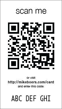Every card has a unique code on it, and a QR code that can be scanned with a phone. Should be useful whenever I give someone a card to contact me with a purpose, as I can customize what is displayed to them when they go to that link. I spent way too much time designing a lovely crypto system to drive the codes, until I decided to simply randomly generate them and keep track. There are ~35 trillion codes of this size, and I'll at most use a couple thousand so as long as I do a little bit of rate limiting on the website (say about an hour of delay if you enter 10 wrong codes) then nobody should ever be able to guess them.