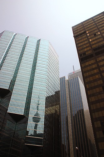 I saw this one while walking up University to King St. Just noticed how well the one facet of that building framed the CN Tower, and my wide angle did the rest. I don't remember if this is the one with the polarizer or not, but I think it is. (I did it with and without it.) I actually think its the one with the polarizer turned 90 degrees to the sky (which coincidentally partially removed the sky reflections from the buildings.) I think that's it... Yeah, I'll stick with that story.