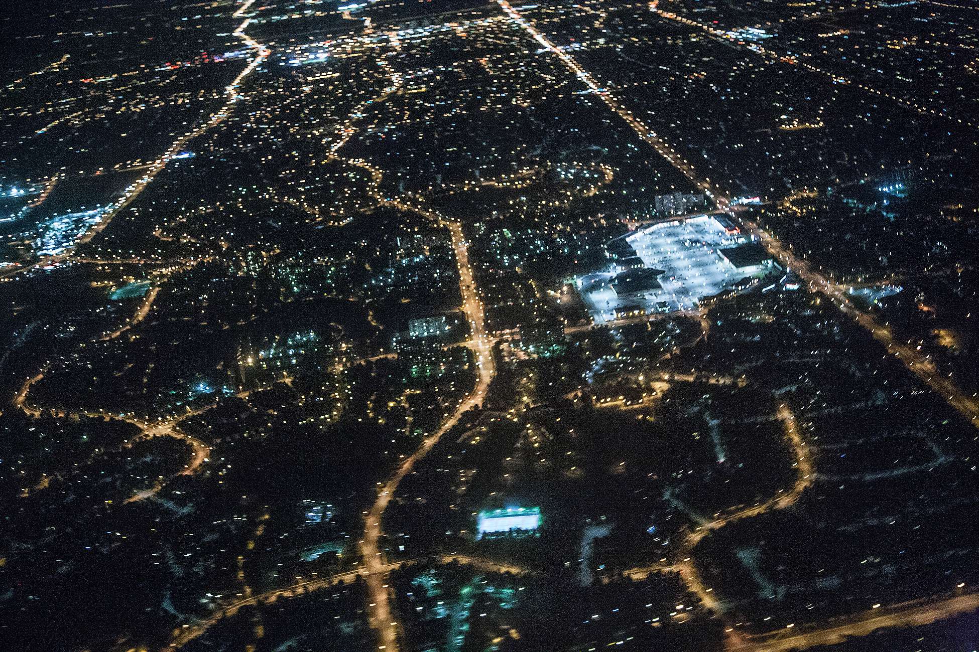 It is tremendously difficult to shoot cities at night while still in flight. Camera shake isn't really a problem, but you are travelling at several hundred km/hr and there is severe parallax blur.